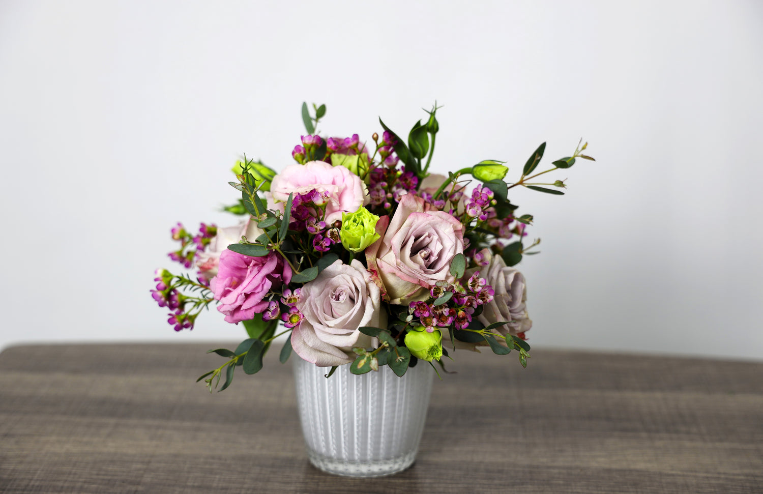 Features: Lavender roses, pink lisianthus, purple wax and eucalyptus.