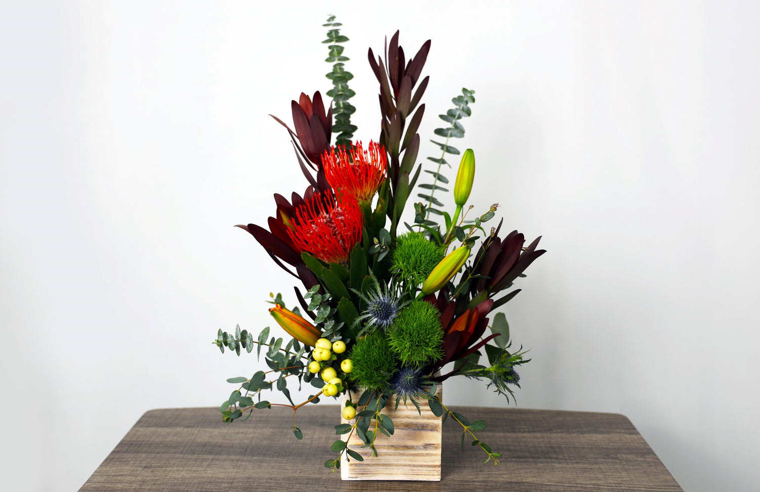 Features: Leucadendron, pin cushion, thistle, green trick, asiatic lily, hypericum, eucalyptus
