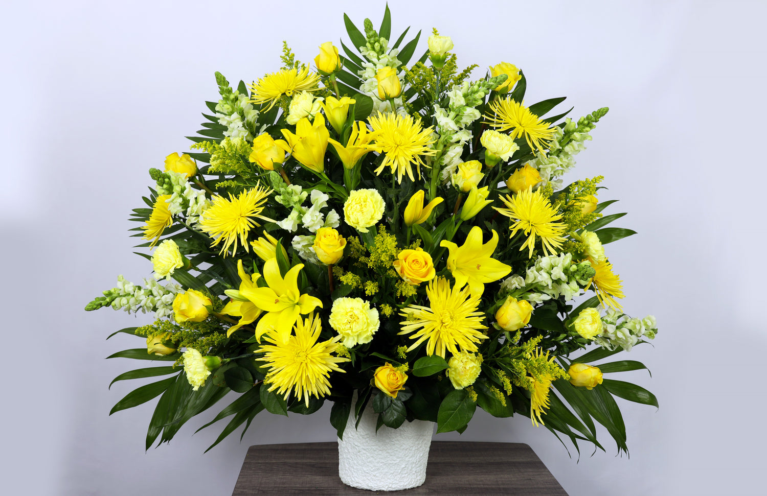 Features: Yellow lilies, yellow roses, yellow carnations, yellow fuji, yellow solidago, white snapdragons, emerald palms and salal.