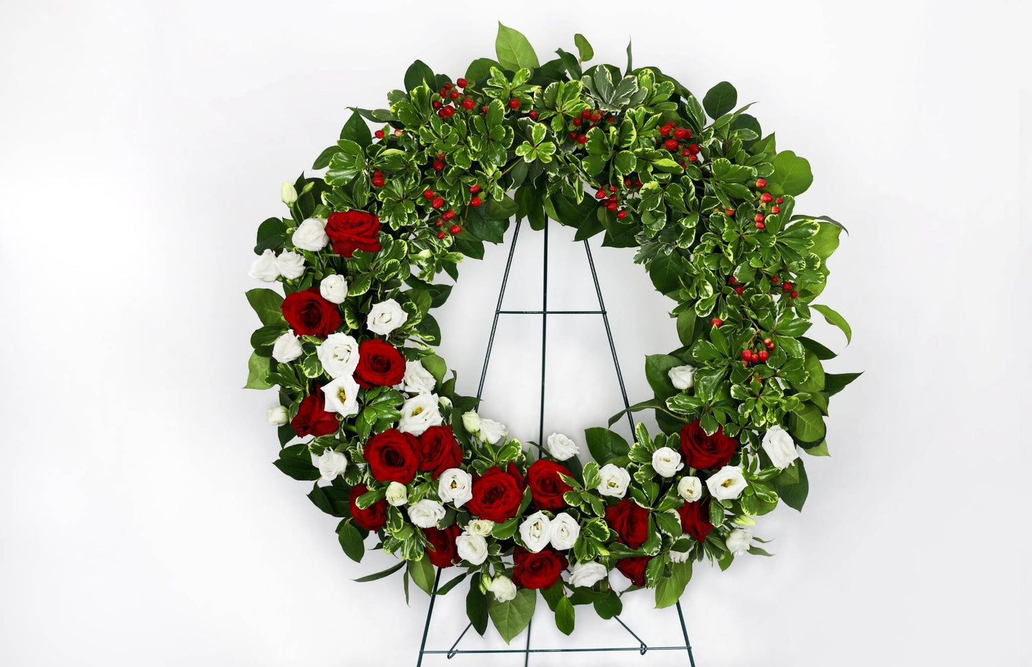 Features: Red roses, red hypericums, white lisianthus, pittosporum variegated and salals.