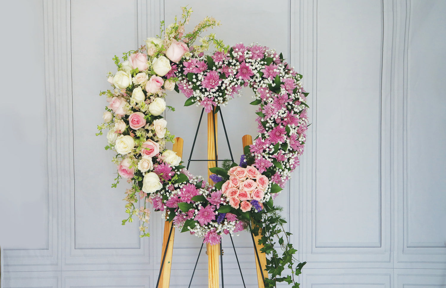 Features: Pink roses, pink larkspurs, pins spray roses, white roses, white spray roses, baby's breath, lavender cushions, isreali ruscus and ivy.