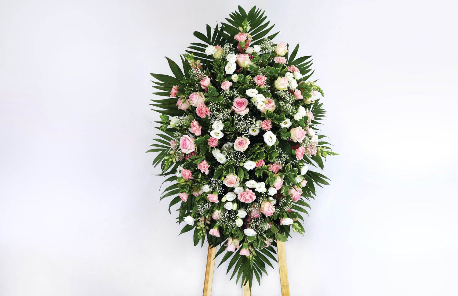 Features: Pink roses, pink carnations, pink snapdragons, white lisianthus, baby's breath, pittosporum variegated, emerald palms and salals.