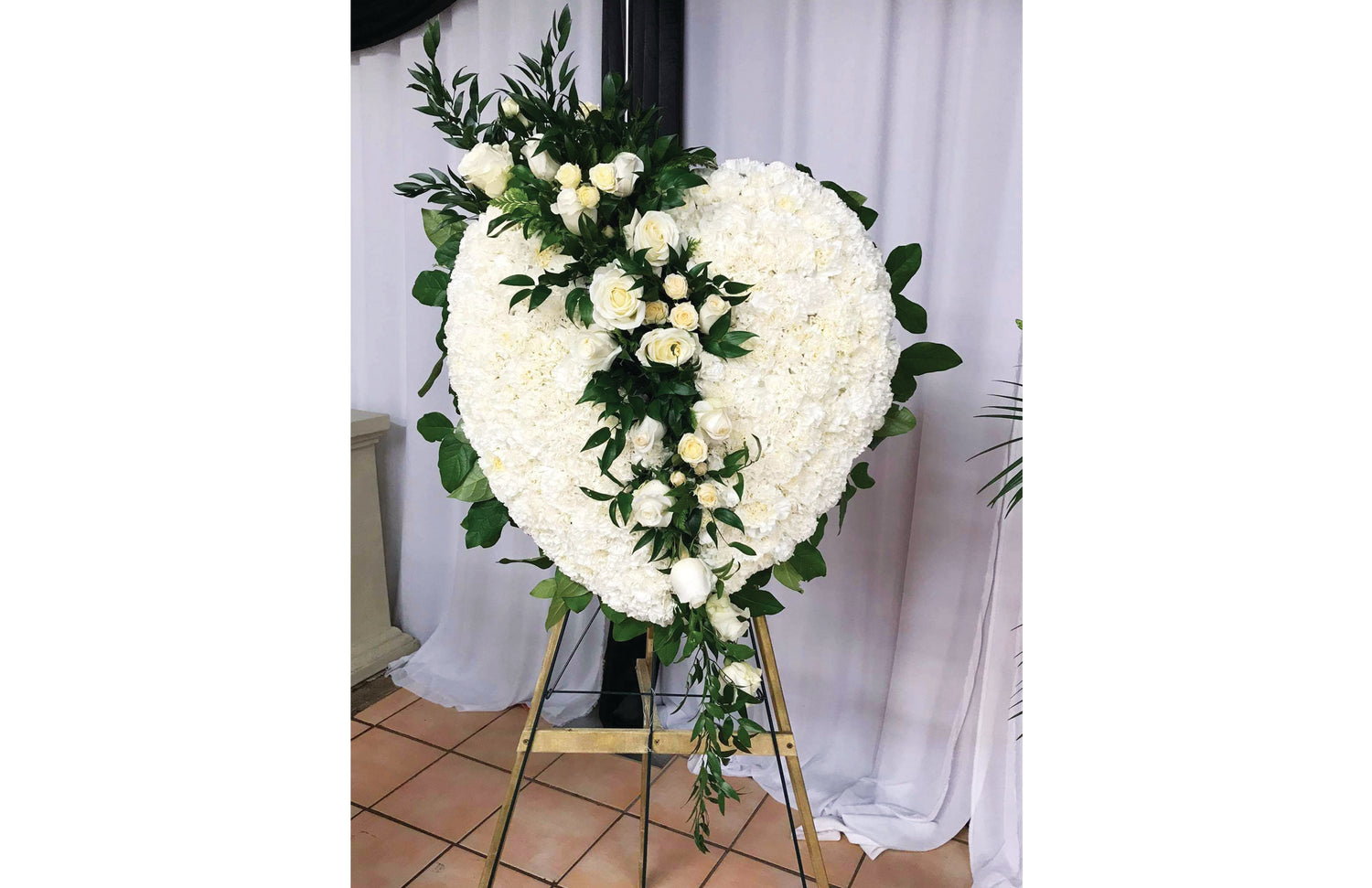Features: White roses, white spray roses, white carnations, Italian ruscus, leather leaves and salal.