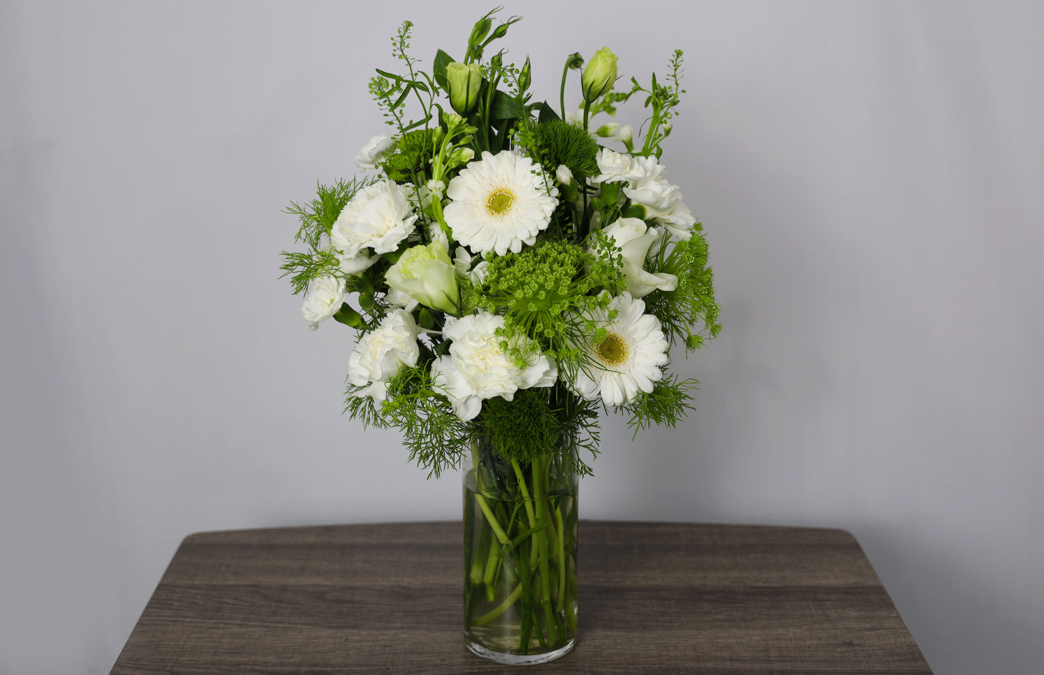 Features: White lisianthus, white carnation, white mini carnation, white gerbera, queen ann lace, pennycress, green button and white roses