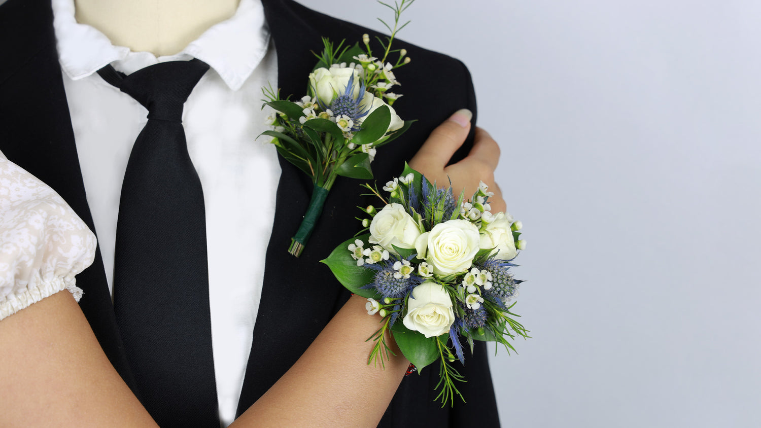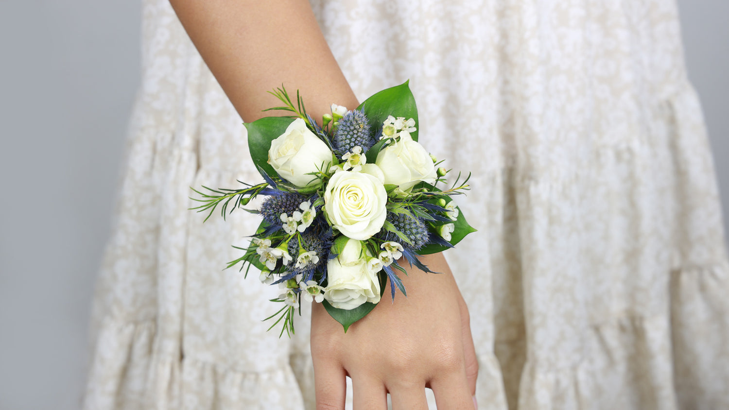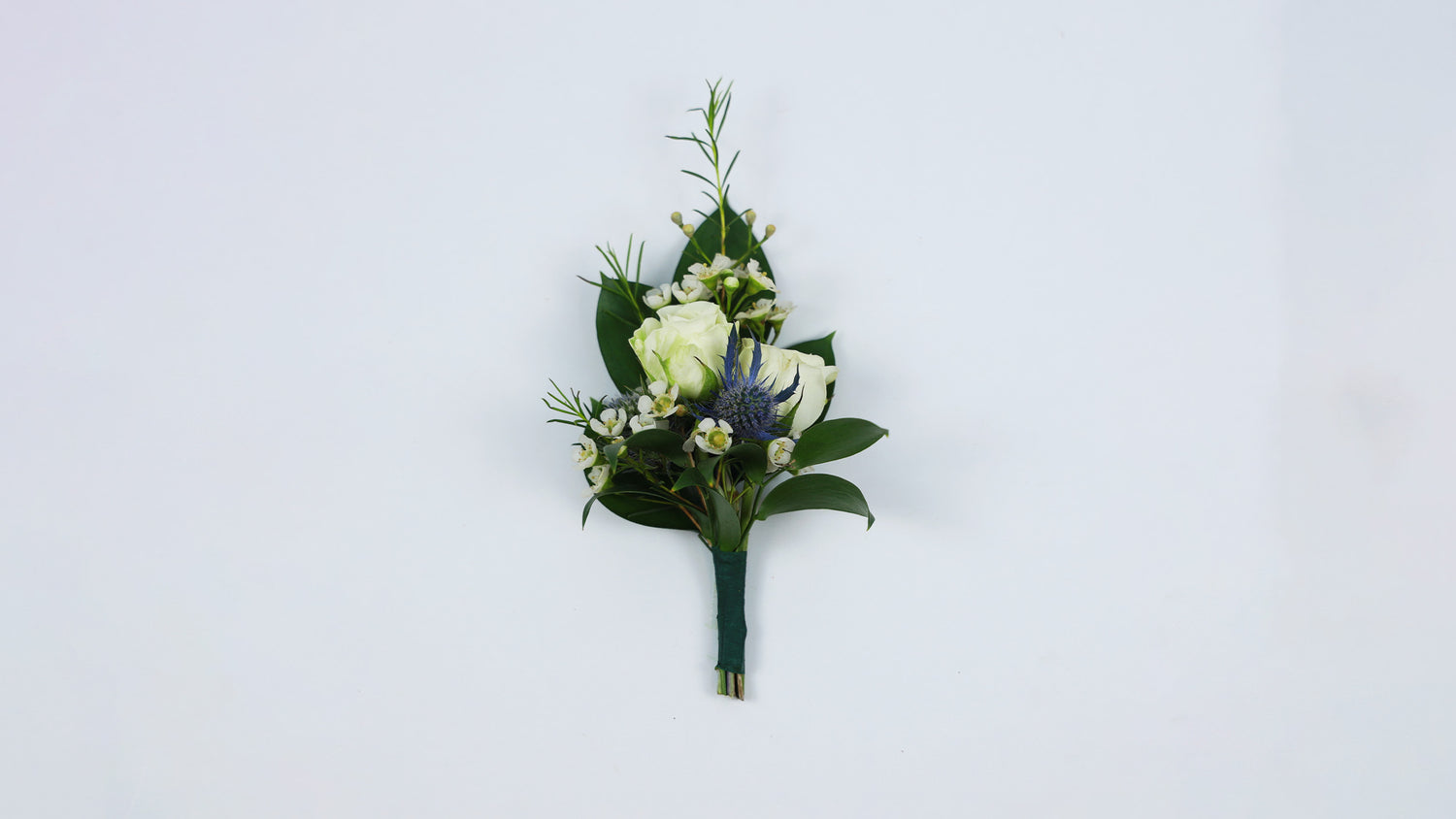 Features: White spray rose, White wax flower, Thistle, Greenery.