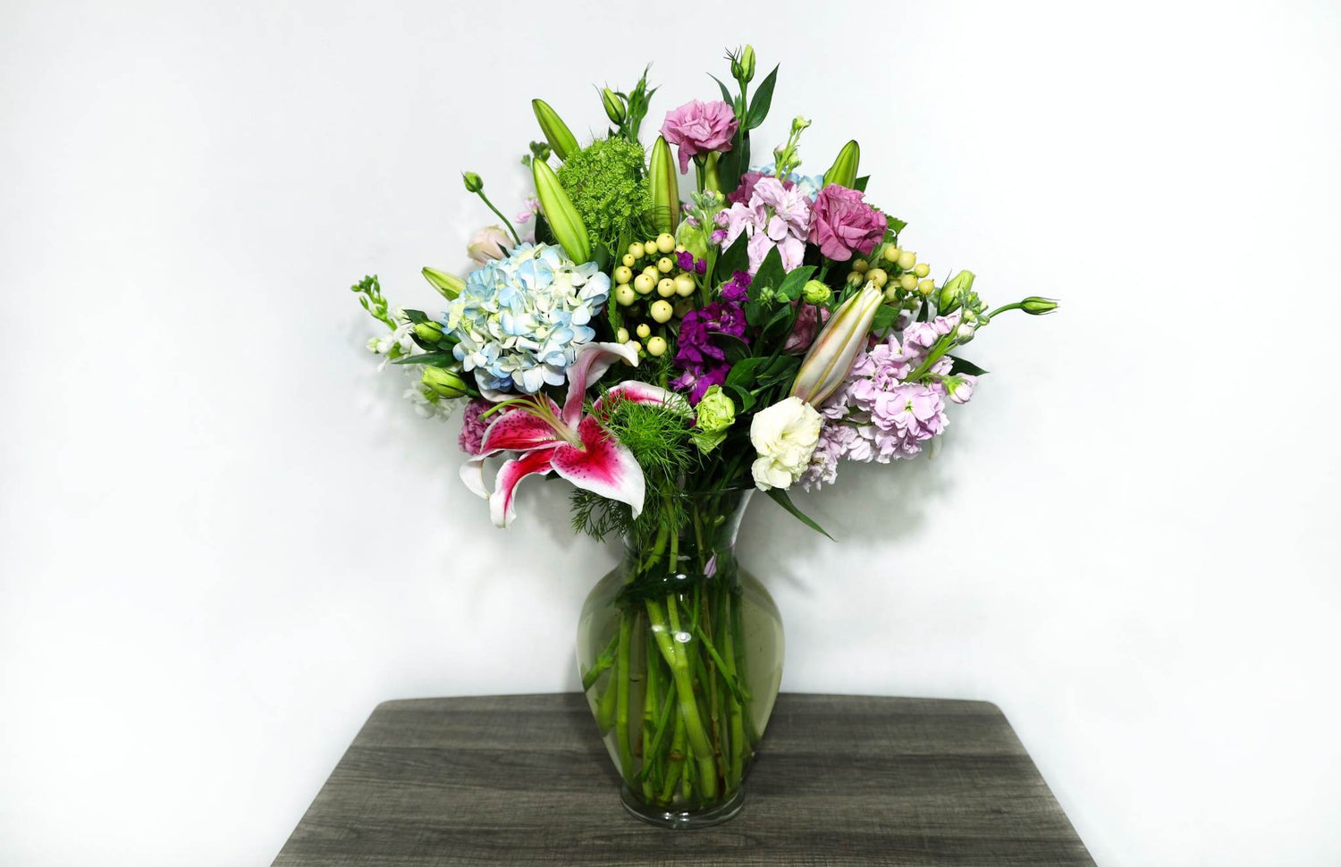 Features: Blue hydrangea, lilies, pink lisianthus, white hypericums, white stock, lavender stock, purple stock, queen anne's lace and salal