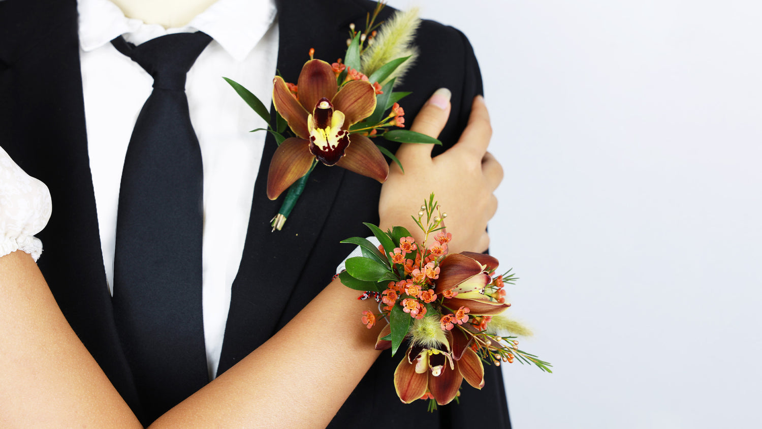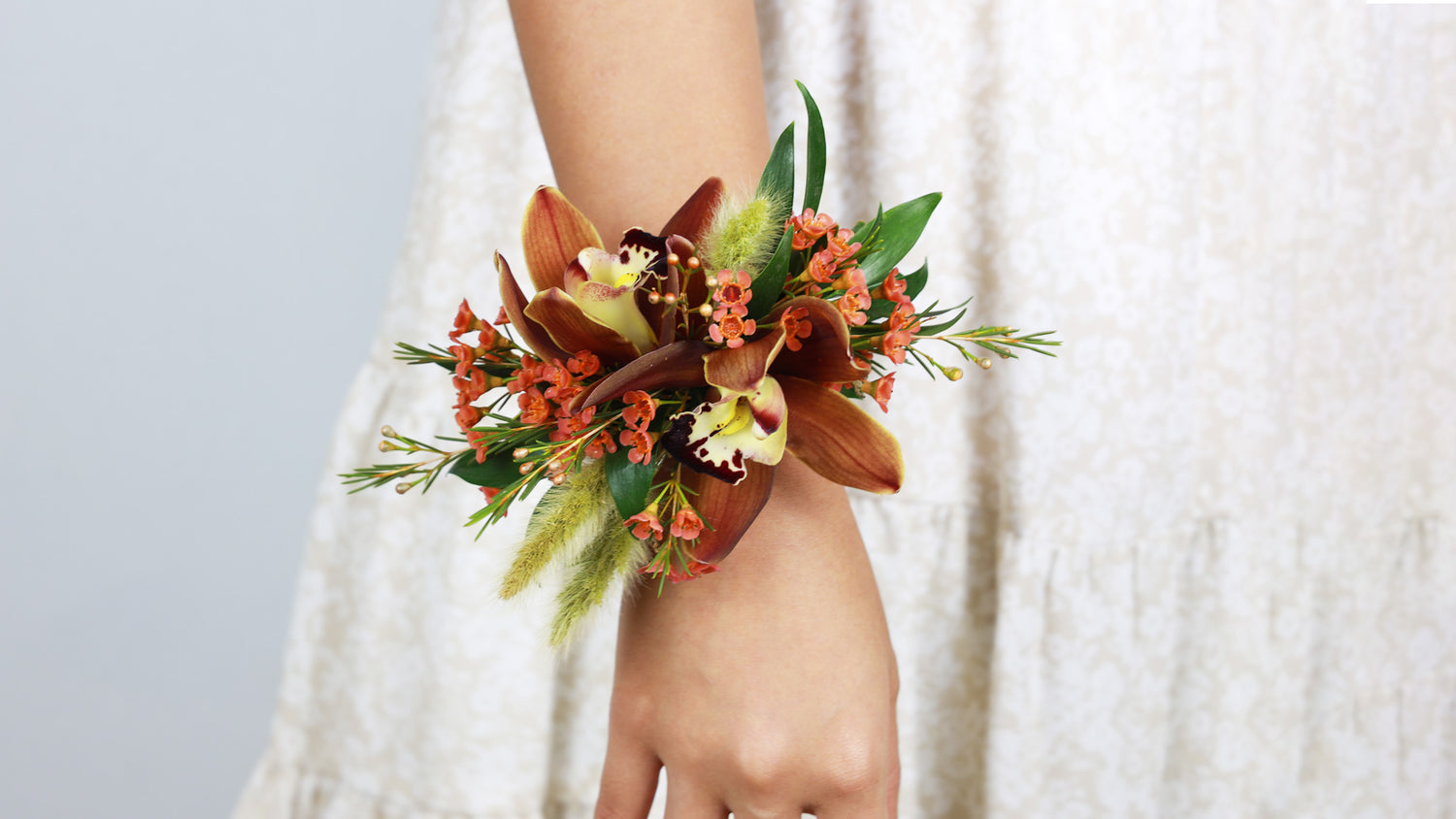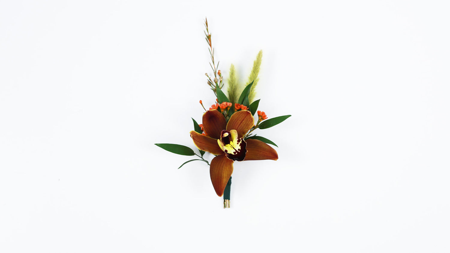 Features: Brown Orchid, Orange wax flower, Bunny tail grass, Italian ruscus.